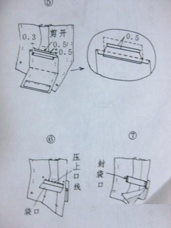 一、袋口斜度、大小照裁剪图,袋口用粘合衬布,勾缉两头。(注意:左右各一只,不要勾缉成同一顺的样式。)