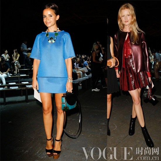 (左):俄罗斯时装编辑Miroslava Duma身着光泽感蓝色梯形上装搭配同色系短裙和蓝色两用手提包,简单但有型的装扮十分适合娇小身材的女孩模仿。(右):时尚摄影师Candice Lake一向喜欢色彩艳丽、充满光泽感的时装,本次出席时装周,身着红色光感夹克外套搭配同色系伞裙和简约黑色短靴,整套造型张弛有度,亮眼而不低俗。