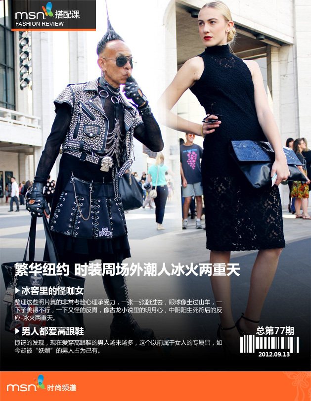2013春夏时装周已于上周开始,秀场内设计师正在用自己的概念诠释对2013春夏的理解,希望能够将这些潮流带入大众;秀场外各色达人也都使出了看家本领,撞色、怪异、反串以及花哨的眼晕的搭配,让人不禁感叹,纽约时装周不亏为四大时装周第一站-将所有怪咖集合起来,像极了一场盛宴中的前菜,五味杂陈,开胃的很。