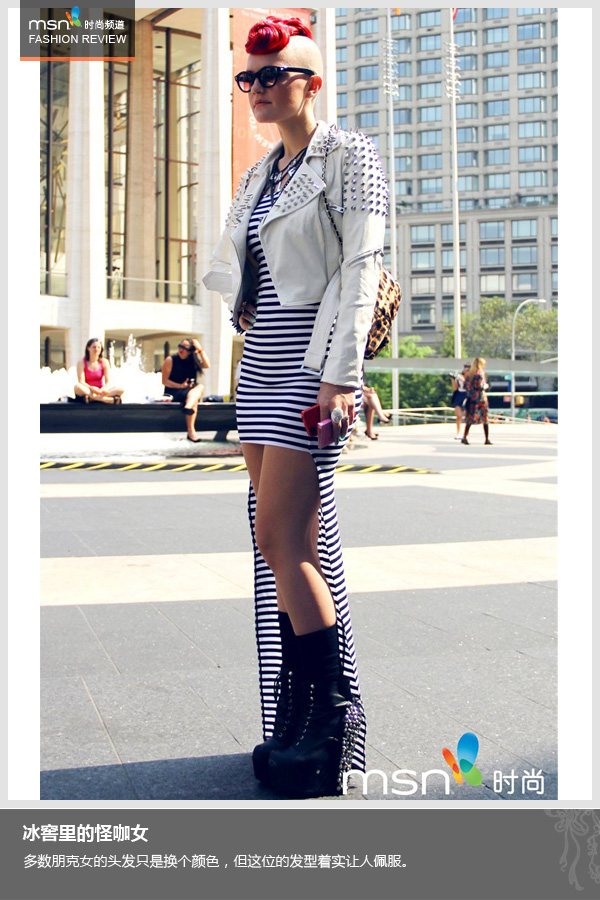 多数朋克女的头发只是换个颜色,但这位的发型着实让人佩服。也许为了配合这样的“潮发”,全身上下也都是铆钉搭配:皮外套的肩领、恨天高的后跟,甚至手上的配饰,都是实实在在的“大钉子”。